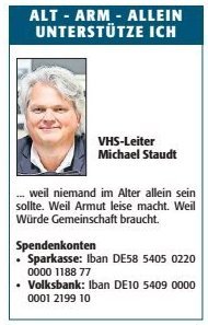 In einer gemeinsamen Sitzung der Spitzen des eingetragenen Vereins alt-arm-allein sowie Vorstandes der Stiftung wurden satzungsgemäß die Gremien der Stiftung alt-arm-allein für die kommenden vier Jahre bestimmt. Das Kuratorium der Stiftung bleibt personell unverändert, die Leitung jedoch obliegt künftig Pfarrer Martin Olf. Weitere Mitglieder sind Marita Gies sowie der bisherige…